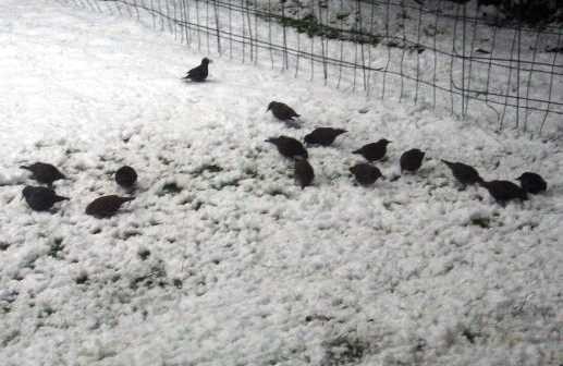 Nun hat sich aber wohl auch bei anderen Amseln verbreitet, dass es hier immer was zu fressen gibt. Eben habe ich 25 Amseln gezählt. Hier ein kleiner Ausschnitt - 15 Amseln.